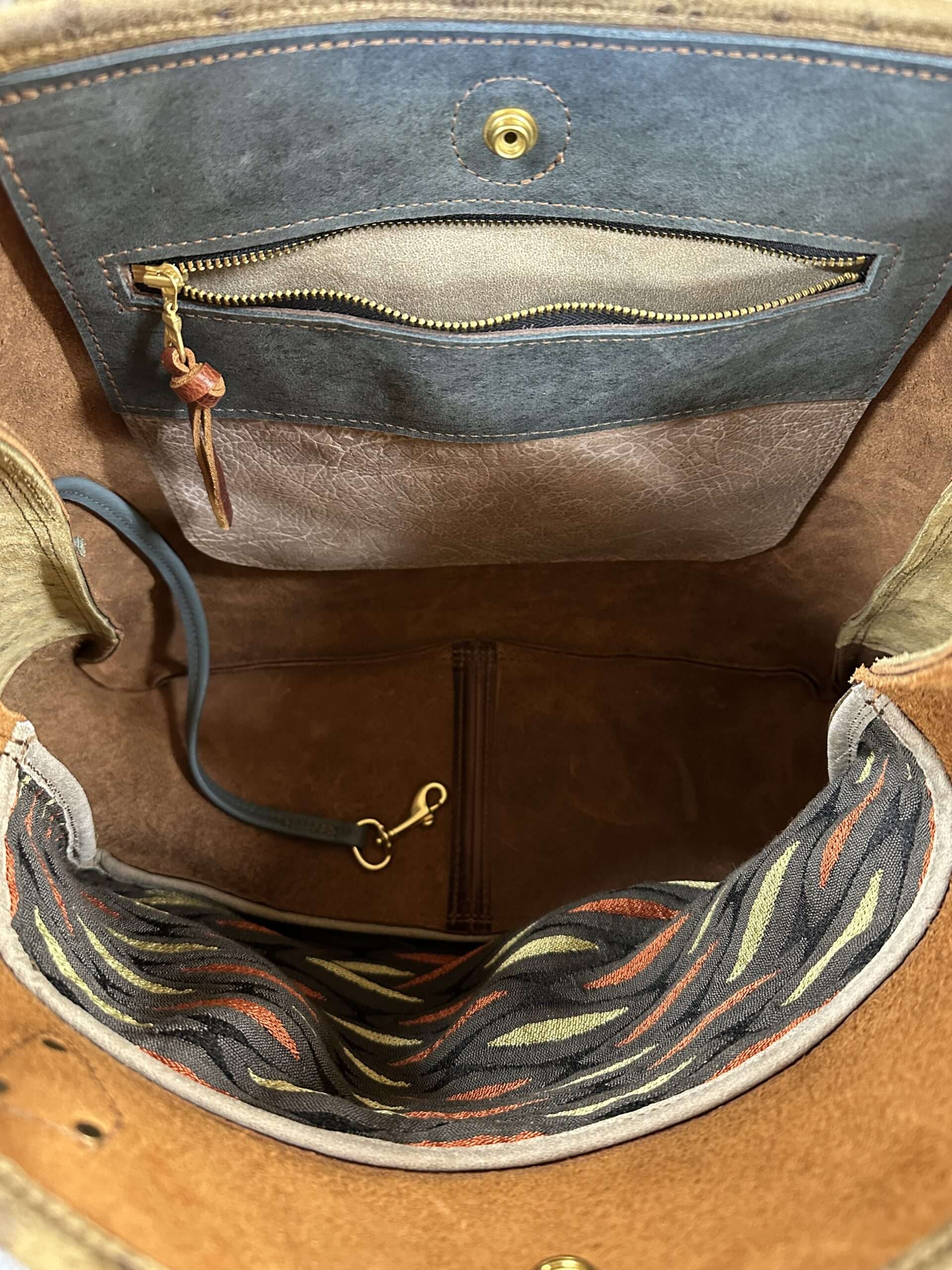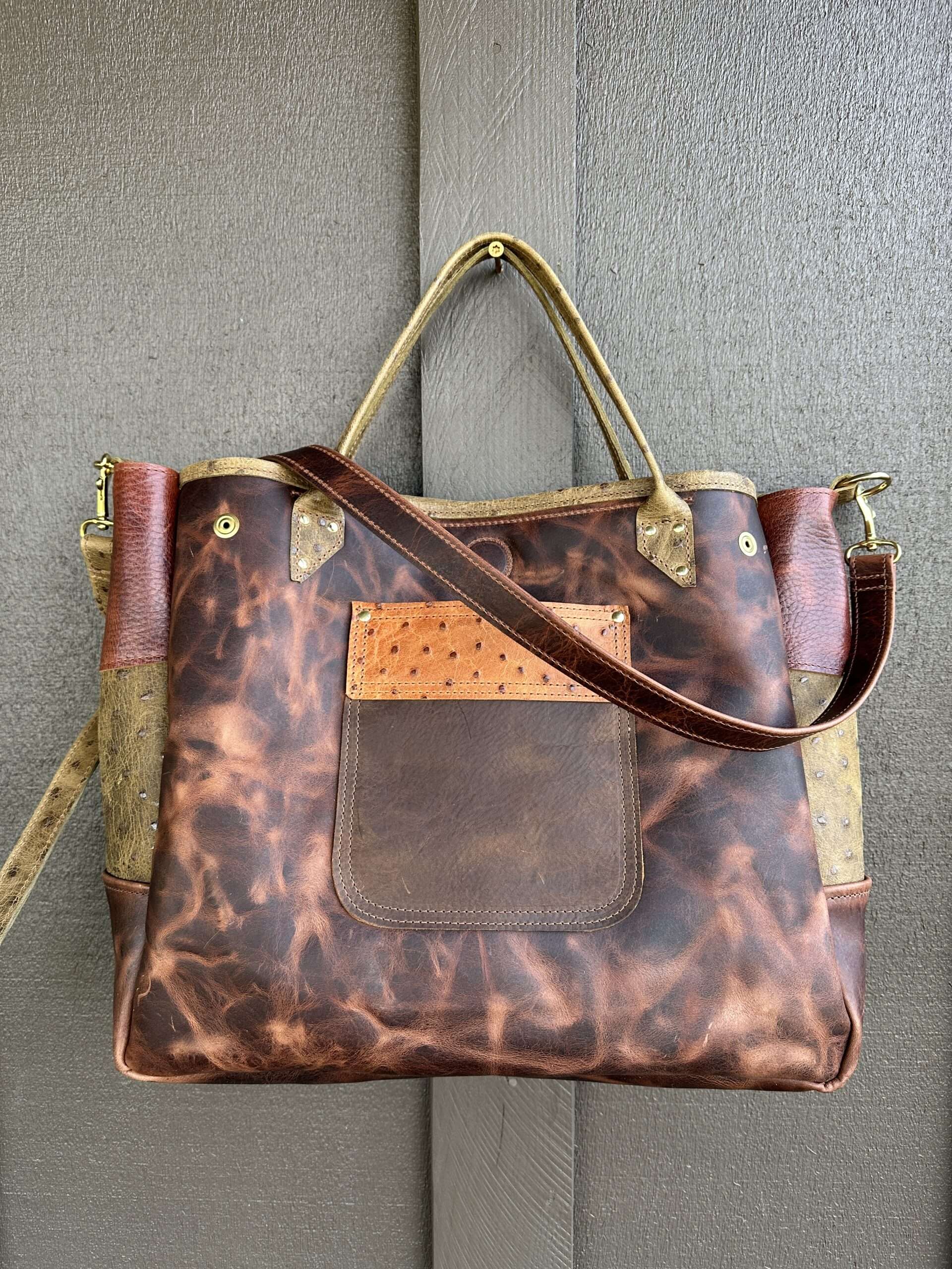My best handbag collection made with all full grain leather and solid brass hardware. This beauty is made with an amazing black needlepoint from the 1950’s with a calla lily bouquet that is stunning-and love this black background! I mixed it with a couple oil tanned brown, and an embossed Ostrich in a olive brown leather. On the back is a quilted leather pocket, perfect for your phone. Inside is lined with a zippered pocket, handles, and a clip on adjustable strap in a combination of leathers.